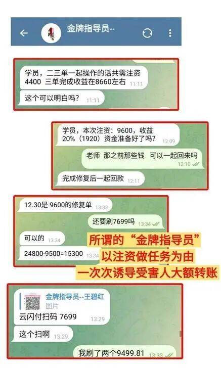 被“快速赚钱”冲昏头脑的受害人先后多次向“导师”提供的收款银行账户转账。随即,“金牌导师”以受害人操作失误或任务未完成、超时等原因,让受害人不得不继续转账以挽回损失。